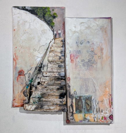 A new series often begins from a photograph of a place I walked – an empty alley in a rural neighborhood with worn wood structures in my hometown, a crumbling and peeling façade in a city block in Detroit, vivid layers of text scribbled to claim a space in New York, a historic building still in use on ancient land in Sicily or Scotland, shored up by whatever was at hand.… all of those were the inspiration for the works in this exhibit, Alleys and Artifacts.