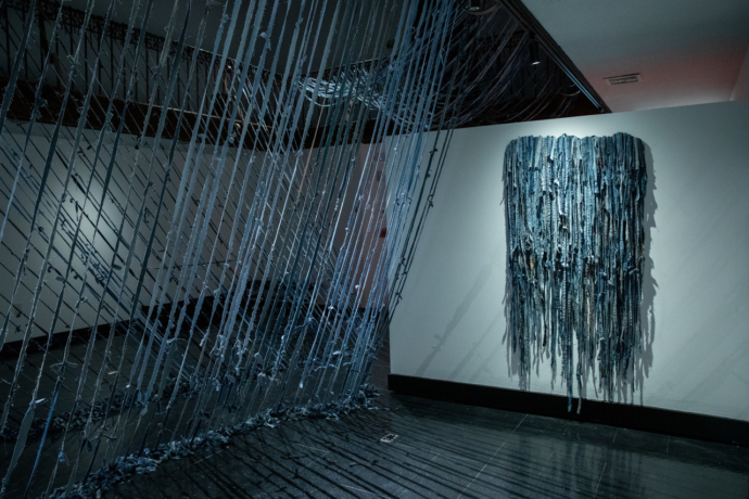 The immersive environment of the installation is rendered in a ubiquitous, mass-produced, and powerfully allusive material—denim from discarded used jeans, crowd-sourced from friends, family, and through social media. Cutting, knotting, and spinning the denim rope onto electrical wire spools was a communal project undertaken with friends and family, and the installation was made possible by the assistance of Cumberland Scholar high school student volunteers from St. Andrew’s-Sewanee School. The denim will be respooled at the close of the exhibition, to be used again.