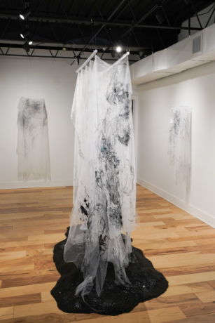 My work traces the fragile edges of memory, time, and space. It centers on what lingers, what fades, and what insists on returning. I think of it as drawing not just on paper, but into air itself. Whether working with delicate pencil marks or suspended silk tulle and thread, I am drawn to the threshold where presence meets absence. These are not illustrations of memory; they are memory embodied, folded, stitched, and layered in translucent form. The work reflects the sensation of being haunted by time in motion, of moving through grief, wonder, and stillness all at once.