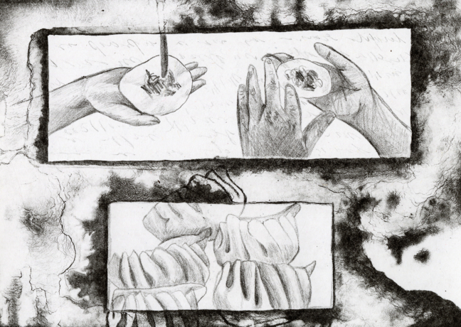 The works in this exhibition use lithographs as a foundation to tell personal stories. Drawing inspiration from our environments, we observe, reflect, and capture meaningful moments as they unfold around us, specifically taking moments from noticing the landscape while driving and cooking. Through drawing, printing, and collaging, we transform these observations into visual narratives, each piece offering a window into our lived experiences.