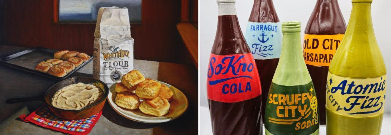 Southern Comforts is a heartfelt tribute to the people, places, and flavors that define the state of Tennessee. Through her paintings, Michelle Lindsey explores everything from iconic architecture to classic Southern foods, and each piece is a conversation about history, community, and the simple comforts that make Tennessee feel like home. Jacene Witzel created complementary ceramic work celebrating the icons and everyday delights of our community. Together, their works weave a story of memory, place, comfort, and a little humor, and they invite viewers to smile and rediscover the joy of what makes East Tennessee home.