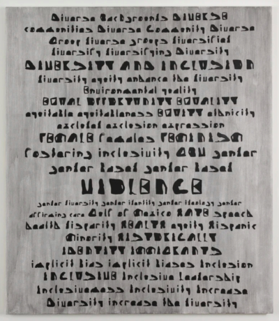 Under the banner of Fall of Freedom - an urgent call to the arts community to unite in defiance of authoritarian forces sweeping the nation - Sheet Cake is proud to present Amy Pleasant's Sense of Belonging series in the gallery’s project space. This series, which includes four large-scale paintings and an ongoing series of drawings, began following the Trump administration’s aggressive roll back of DEI efforts and the banning of specific words and phrases termed “woke initiatives”. Pleasant felt compelled to write and re-write this list as an act of preservation and endurance. Each work includes some of the 250+ words including “accessible, activism, activists” to “climate crisis”, and the list ends with “women and underrepresented”. The title for this series, Sense of Belonging, a phrase also included on the list, describes the collection in its entirety, in an effort to create space and visibility for all.