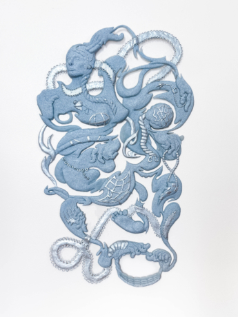 "My work weaves together the emotional landscapes women wade through to find contentment. Tasked to perform the roles of caretaker and achiever while maintaining beauty ideals, tension is formed through the pressures of living up to societal expectations. This fraught feminine interiority is expressed through forms that intertwine, pierce, and cradle. Strength and softness unfold throughout, reflective of apprehension and the balm of growth, comfort, and connection. Dusty gardens filled with playful and cutting amulets surround figures that tie themselves up into knots. A miscellany of objects likened to frilly accoutrements and weapons become armors of ornamentation. These amalgams of abstracted mementos and charms serve as soothing shields. They echo resilience while entwining gentle threads of feminine delight. Inspired by the rich tapestry of myth and fantasy, these visual narratives provide portals to escapism through their whimsical and melancholic meandering. Moments of discovery are revealed within intricacies that evoke intimate aspects of sexuality, mental health, and memory. I center muted stories of femme experience, exploring where self-discovery meets mercurial longing and offering space for reflection, transformation, and tenderness." - Erica Westenberger