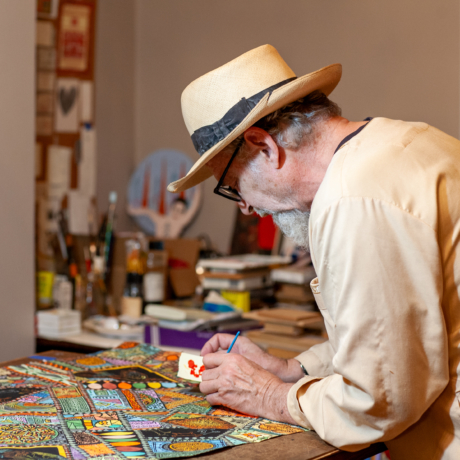 From Brayer to Brush showcases original woodblock prints by master printmaker Jim Sherraden, whose richly patterned works evoke textiles, nature, and decades of innovation shaped by his 34-year tenure at Nashville’s iconic Hatch Show Print. Prior to the exhibition’s opening reception, an artist talk will take audiences through a chronological journey of his career, from the work that led him to Hatch Show Print, through key projects created there, to the work he has made since departing in 2018.