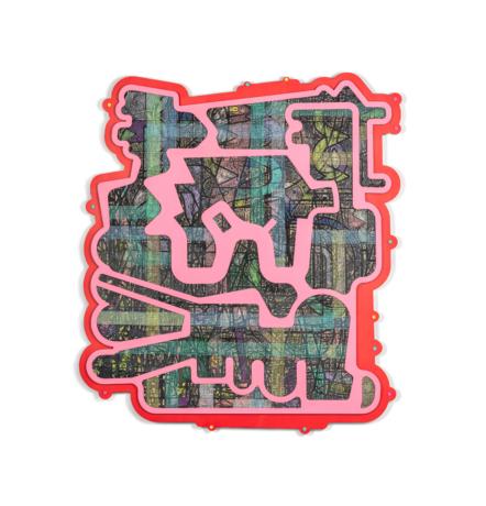 In this body of work, Slaughter incorporates found materials like car mats, as well as painted grids that reveal the artist’s hand in contrast to the perfect, machine-cut curves of the MDF. Their chromatic intensity and compositional dynamism echo the design philosophy of the Memphis Group, while their abstract forms are reminiscent of graffiti and street art.