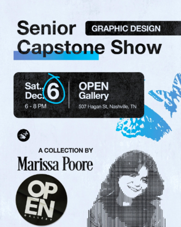 Join us as we open our senior capstone show for Marissa Poore. This collection holds some of Marissa's favorite projects from her time studying graphic design at Lipscomb. The show highlights what she enjoys creating and what she's learned along the way