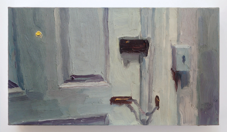 Ogilvie’s brilliant impasto paintings take up two subject matters which differ drastically in size: 7 foot reproductions of the famed Paramount Pictures title card dwarf 6 inch paintings of closed (or slightly-ajar) doors appropriated from horror film stills. Ogilvie’s miniscule thresholds convey a classic anxiety, which, in the context of the artificial, near-mythological, language of the Hollywood set, is hard to separate from natural disaster and precarity, as taken up by Mike Davis’ seminal book Ecology of Fear.