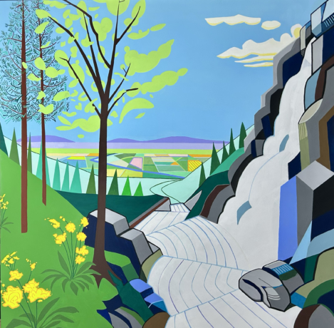 Modfellows is proud to exhibit works by painter Martin Kahnle in his second solo exhibition at Modfellows. He will be presenting his new wave American landscapes on canvas. Over the last two years, Kahnle has been developing a body of landscape paintings in Flashe, a vinyl paint with a flat, matte finish and a vivid, high-color presence that pushes the works into a different visual language. The surface is drier, flatter, and more graphic than oil, and that shift opened something up for Kahnle. The works became bolder, more distilled, and a little stranger-in the best way. These paintings begin in the landscapes of Tennessee, North Georgia, and the broader Southeast, but they are not trying to document a place literally. Kahnle is more interested in the emotional truth of a landscape-how it feels in memory, how color can sharpen it, bend it, and make it more itself than realism ever could. The easiest way to describe this body of work is probably as a romantic fling between David Hockney and a classic Warner Bros. cartoon. Somehow, they had a love child and sent it wandering through the American South. That may sound playful, but it is close to the truth. Kahnle has always loved the clean confidence of modern painting and the heightened, emotionally exact artificiality of classic cartoon backgrounds. Both understand that a landscape can be stylized and still feel completely real. The Curve of the Current marks an important new turn in his works.