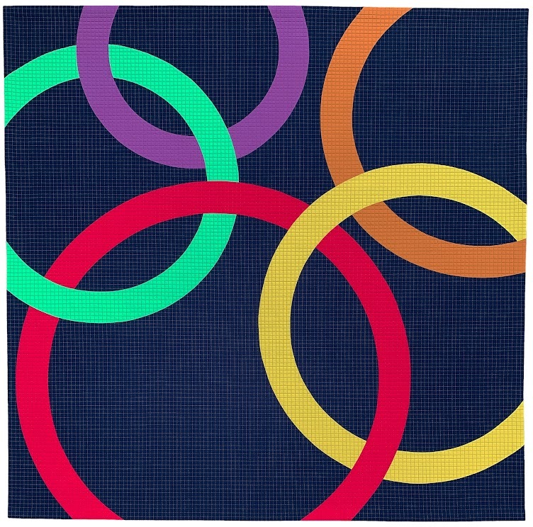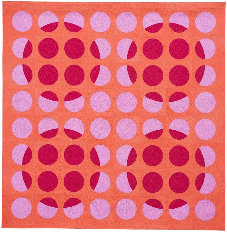 KS: The continuous, symmetrical, unbroken line of a circle has represented unity and wholeness in many cultures for millennia. The technical challenge comes via my preferred method of constructing circles, which is called “machine piecing.” Two pieces of fabric are sandwiched together, with their right sides facing each other, and stitched using a sewing machine. Then they are folded back along the stitching line so the right sides face the viewer. That is relatively simple to do with straight-line shapes like rectangles or squares, but circles involve convex and concave curves that must be nestled into one another and fed through the sewing machine with care.