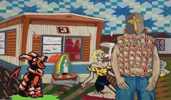 IK: What I really love about Family of Saltimbanques is the drama of the figures and the sexual tension. The implication of a cucking scenario being at play really changes the way the viewer perceives the figures. I really wanted to engage with the kind of dialogue that the narrative is moved around by the gazes, and the figures tell you what’s going on by their placement. I’d be having this idea of an adaptation of Hamlet, but it was set in a trailer park. I was also thinking a lot about how, no matter what trailer park you go to there’s someone who has a valure rebel flag blocking sunlight in their window. This weird common occurrence feels like super close to how narrow-minded thoughts just won’t die and definitely find root in low-income spaces. If you’ve ever spent any time in the trailer parks in around folks that live in trailer parks not as a generalization, but just like a based in my own experience, it often feels really surreal and plays out almost like a soap opera the way that people live in the way that they kind of engage in these cycles, and I knew that you know if I was to preface my experience or if I was to reference my life in a way that connects to the art historical canon it would be through something that humor, but also an area for great depth . Because of all these thoughts is started playing with the theatrical trailer park scene. Walt Whitman once said humor is judgment cast, the night figures went into paintings represent southern white Christian men, the Templar helmets being connected to the historical Knight figures that participated in the Crusades that Templar idea that they are part of a larger system that they can only participate in to attempt to enjoy its benefits yet while their power or their agency is related to their body and how they use them via labor or violence. For these reasons, the knight feels the most pertinent allegory for me to talk about Southern white Christian men. When I’m showing these Knight figures, I can’t help but empathize with the greater machine they’re a part of that removes or forces their choices in how to think and live. However, as someone who comes from the same place, I also recognize the ability of one’s choice to acknowledge the system and how you can exist outside of that system. The figures within the painting act as critiques on the way that people tend to characterize themselves based on their cultural teachings or understandings of what it means to be Southern. This can come from so many different places, so many different signifiers, but in my experience, it feels like folks attach to an idealized notion of being Southern and the way folks latch on to stereotypes. They run with them these notions their whole lives, and that’s reinforced by so many different social factors, so the figures emphasize the larger ideas in their scenarios. These ideas are extremely close, particularly to the zealous Christian nature of my family, and how our economic standing and place affect our viewpoints.
